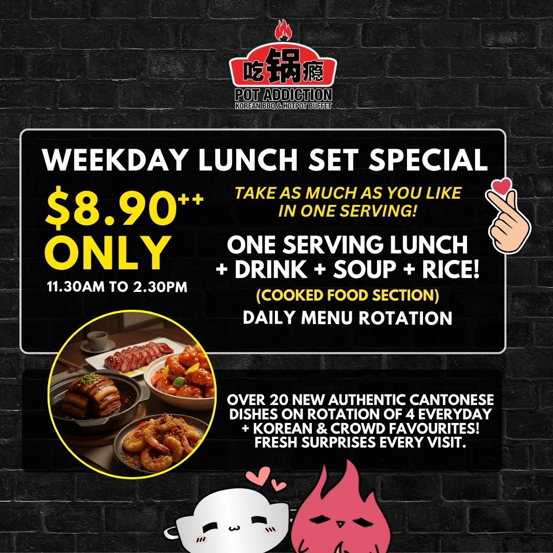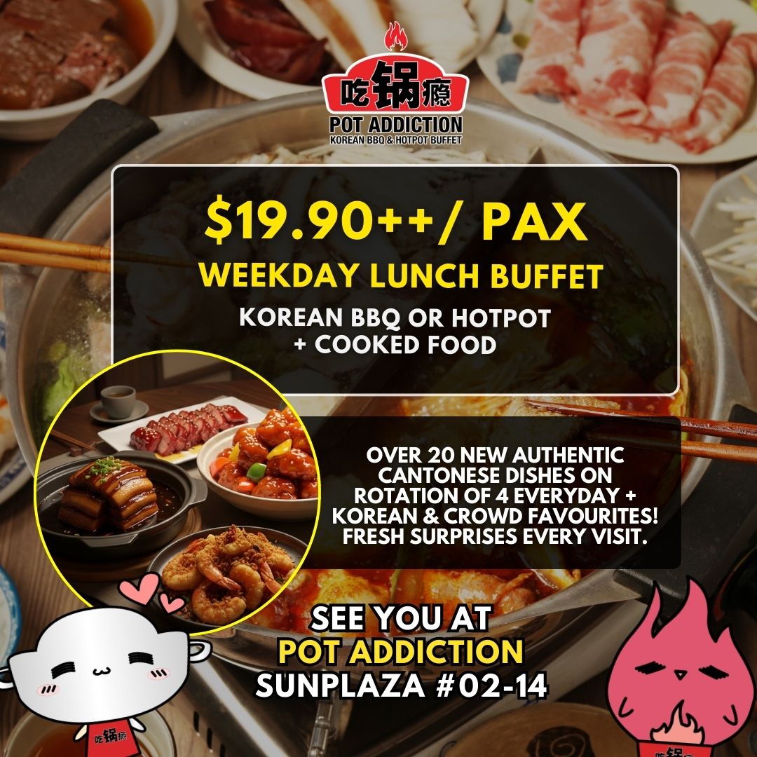 At Pot Addiction, enjoy a Korean BBQ or Hotpot Buffet for just $18.90++! 🥢🔥 Satisfy your cravings without breaking the bank, because great food doesn’t have to cost a fortune!